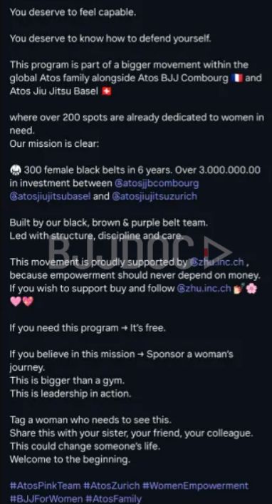 Jonathas Eliaquim, head instructor at Atos Zurich, announced the “Atos Pink Team” program on Valentine’s Day, offering four free Brazilian Jiu-Jitsu classes per week to women who have experienced “any type of unwanted situation.” The initiative spans three European locations, Zurich and Basel in Switzerland and Combourg in France, with over 200 spots already allocated.