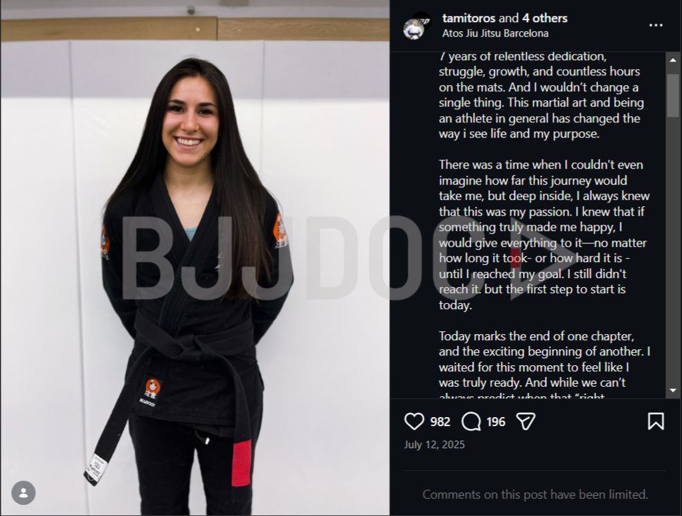 That timeline has raised serious concerns. Competition records indicate Toros has been training for approximately seven years, placing the start of her jiu-jitsu journey around the age of 14. Images circulating online show Toros as a yellow belt training under Gustavo Galvao’s instruction. Two independent sources state she was 14 at the time. Under International Brazilian Jiu-Jitsu Federation rules, yellow belt is a youth rank with an upper age limit of 15, lending further weight to the timeline being scrutinized.