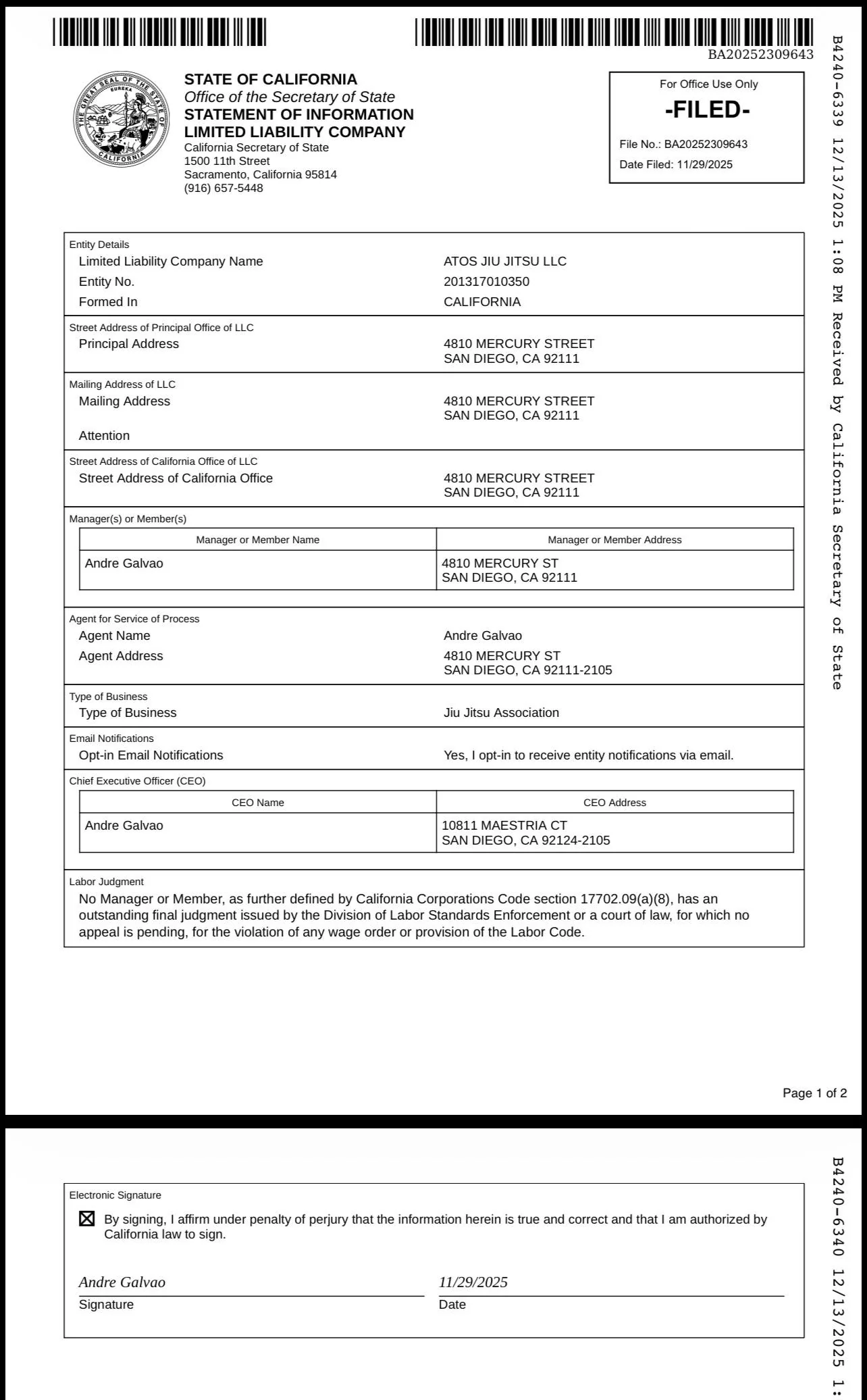 A quick search of California Secretary of State records reveals that Atos Jiu Jitsu LLC lists Andre Galvao as its sole registered agent. The company has been delinquent on required filings since 2016 and has maintained a suspended license status since 2017, though informational updates were made in 2025. Galvao also operates Galvao Jiu Jitsu LLC, Galvao Jiu Jitsu 2 LLC, and Galvao Jiu Jitsu 3 LLC, all currently active with him listed as the agent for service. R/bjj was first to look into the corporate structure.