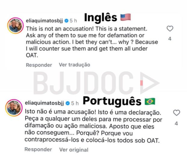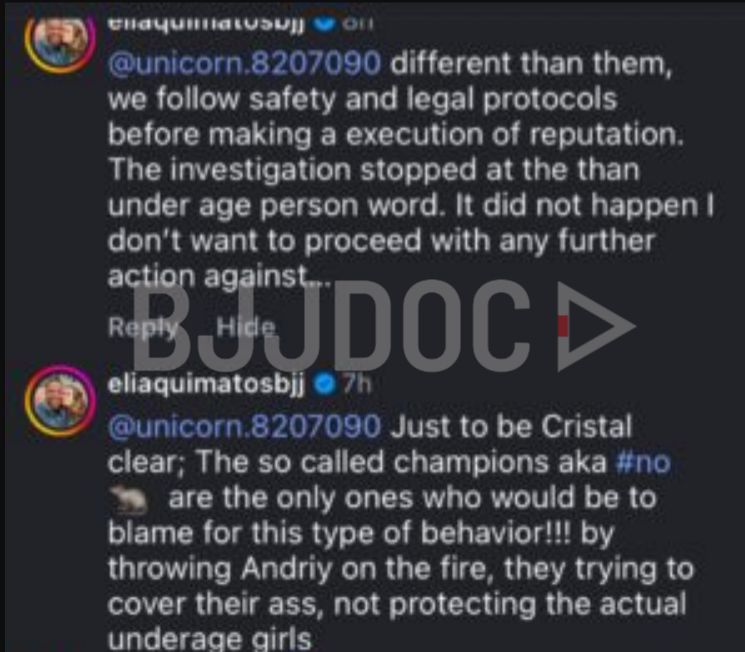 Jonathas Eliaquim, head instructor at Atos Zurich, escalated the controversy in a series of Instagram comments claiming that certain high profile athletes who recently left the organization engaged in relationships with teen girls and that their public departures were motivated by self preservation rather than principle.