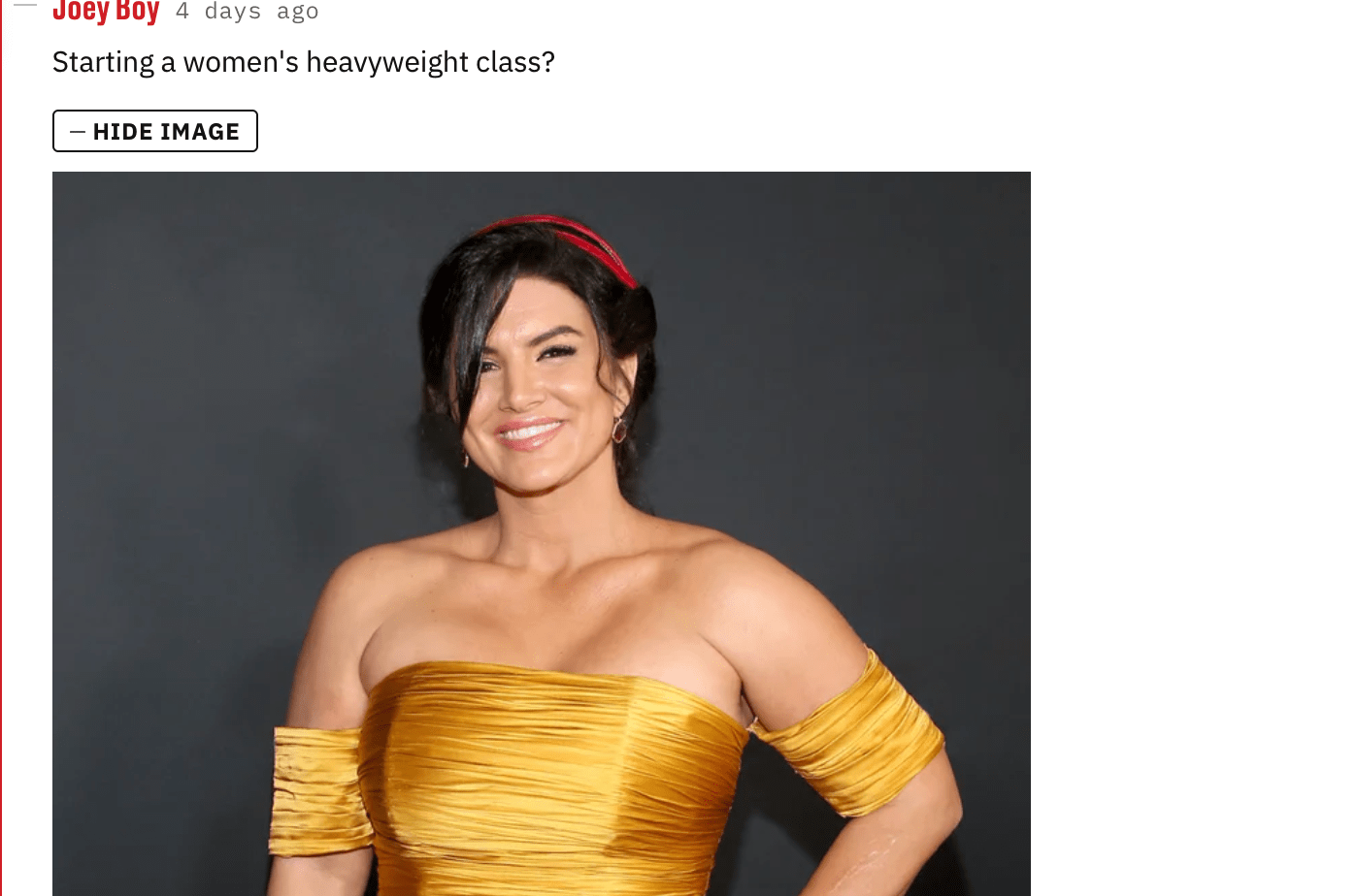 Women’s MMA pioneer Gina Carano is back in the gym. Maybe she’s training for a Ronda Rousey super fight, or maybe she’s just getting in shape from missing out on those Disney checks.