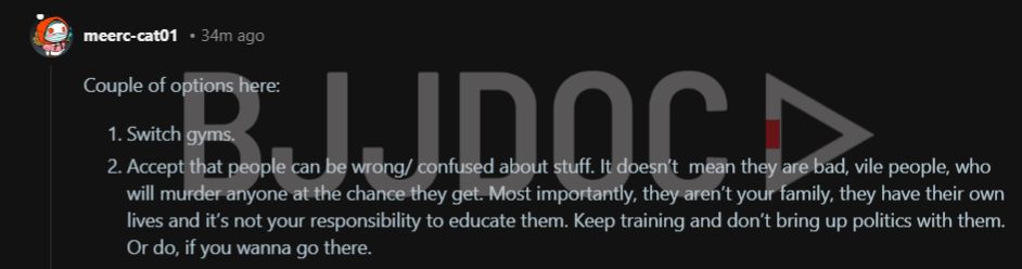 Some people insist the solution is discipline, just do not talk about it. A purple belt shared their approach, shut down political conversations the moment they start, acknowledge disagreement exists and get back to drilling armbars. It is a reasonable strategy, maybe even the mature one. But others argue this particular moment transcends normal political disagreement.