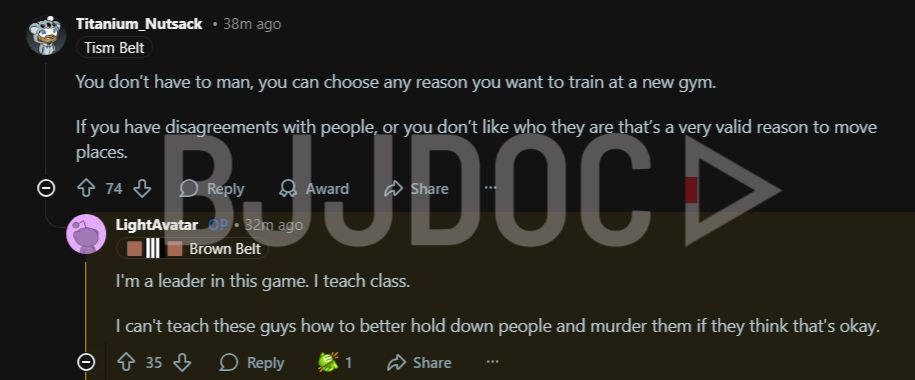 The real point is this, no two dojos are exactly alike and what works for one person will not work for another. Finding a place where you can train without that gnawing feeling in your stomach matters. Whether that means seeking out a gym that shares your values or finding one where nobody talks about anything outside technique and competition is your call. If the environment feels wrong, if you cannot trust your training partners or your instructor makes your skin crawl or the culture just does not sit right, then it is wrong for you and that is reason enough to find somewhere else.