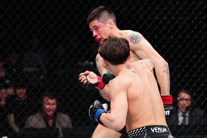 MEXICO CITY, MEXICO – FEBRUARY 28: (R-L) Lone’er Kavanagh of England punches Brandon Moreno of Mexico in a flyweight fight during the UFC Fight Night event at Arena CDMX on February 28, 2026 in Mexico City, Mexico. (Photo by Jeff Bottari/Zuffa LLC)