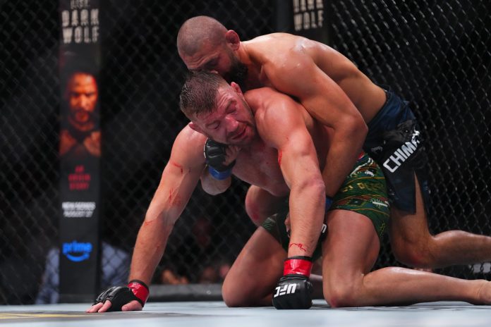 CHICAGO, ILLINOIS – AUGUST 16: Khamzat Chimaev of Russia controls Dricus Du Plessis of South Africa on the mat in the UFC middleweight championship fight during the UFC 319 event at the United Center on August 16, 2025 in Chicago, Illinois. (Photo by Cooper Neill/Zuffa LLC)
