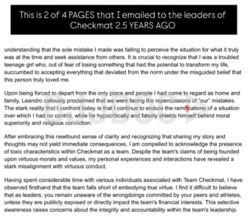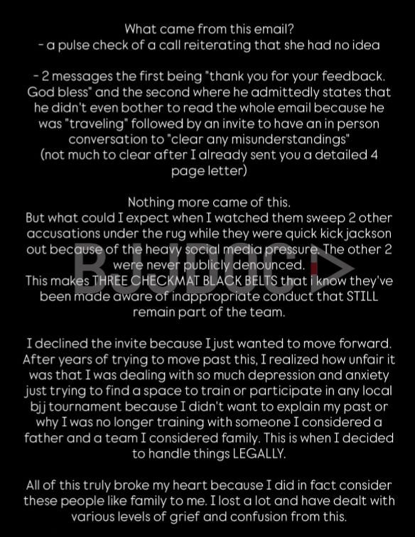 “This makes THREE CHECKMAT BLACK BELTS that I know have been made aware of inappropriate conduct that STILL remain part of the team.”
