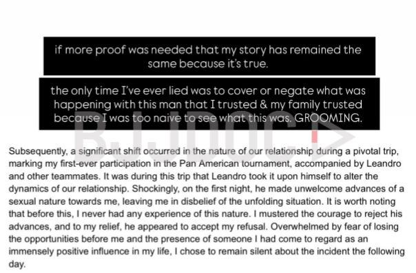 In screenshots shared publicly, detailed correspondence sent to checkmat leadership more than two years ago outlined a relationship that allegedly began inappropriately during the athlete’s first Pan American tournament while traveling with Leandro Vieira and other teammates.