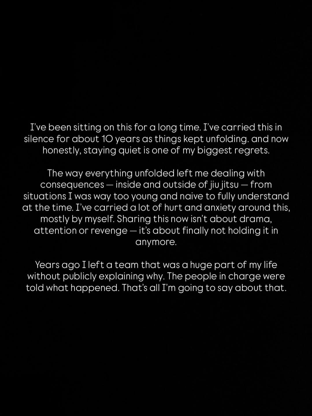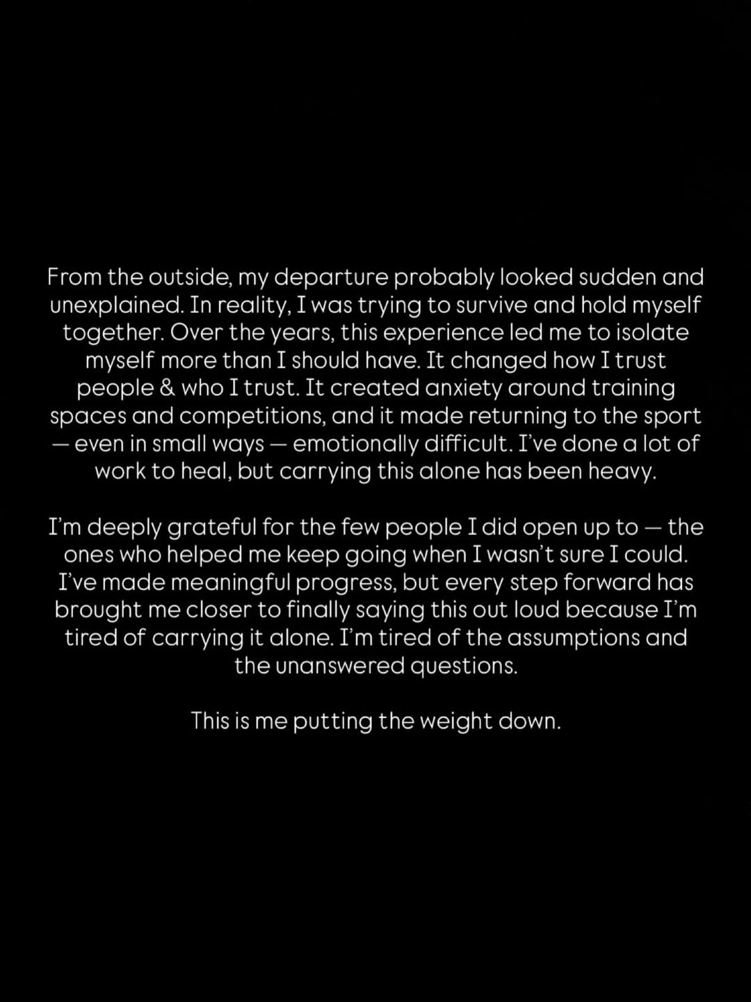“Over the years, this experience led me to isolate myself more than I should have. It changed how I trust people and who I trust. It created anxiety around training spaces and competitions, and it made returning to the sport, even in small ways, emotionally difficult.”