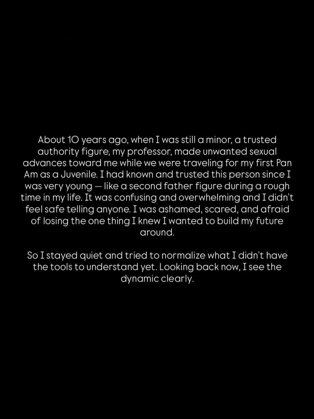 “It was confusing and overwhelming and I didn’t feel safe telling anyone. I was ashamed, scared, and afraid of losing the one thing I knew I wanted to build my future around. So I stayed quiet and tried to normalize what I didn’t have the tools to understand yet. Looking back now, I see the dynamic clearly.”