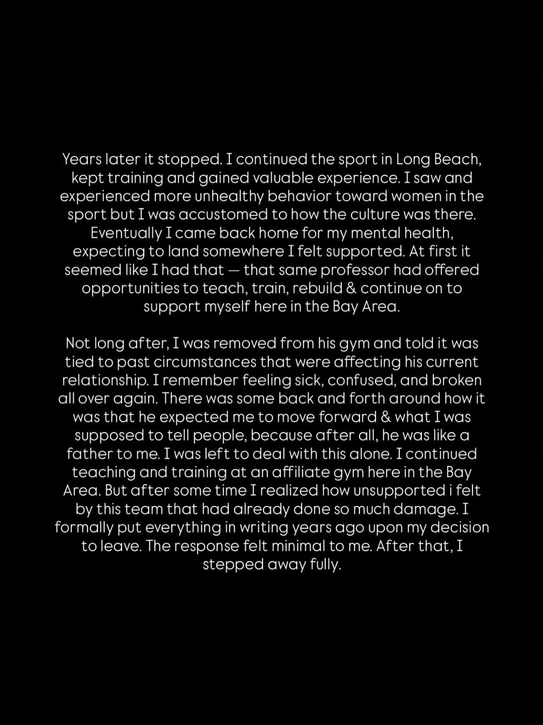 When she later returned to the Bay Area seeking support, the same professor offered her teaching and training opportunities, only to remove her from his gym shortly afterward, citing how past circumstances were affecting his current relationship.