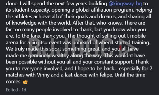 “If I’m going to compete in that, then I’m planning to start competing like before then. Like I always like to do a lot of competitions when I ramp up to ADCC just to get whatever rust I have off. So if my stomach is able to do that, then that would be my plans.”