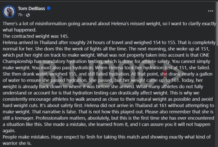Coach and BJJ black belt Tom DeBlass talked about the controversy in a recent post. According to him, the contracted weight was 145 lbs (65.8 kg). Crevar arrived in Thailand weighing between 154 and 155 pounds after nearly 24 hours of travel.