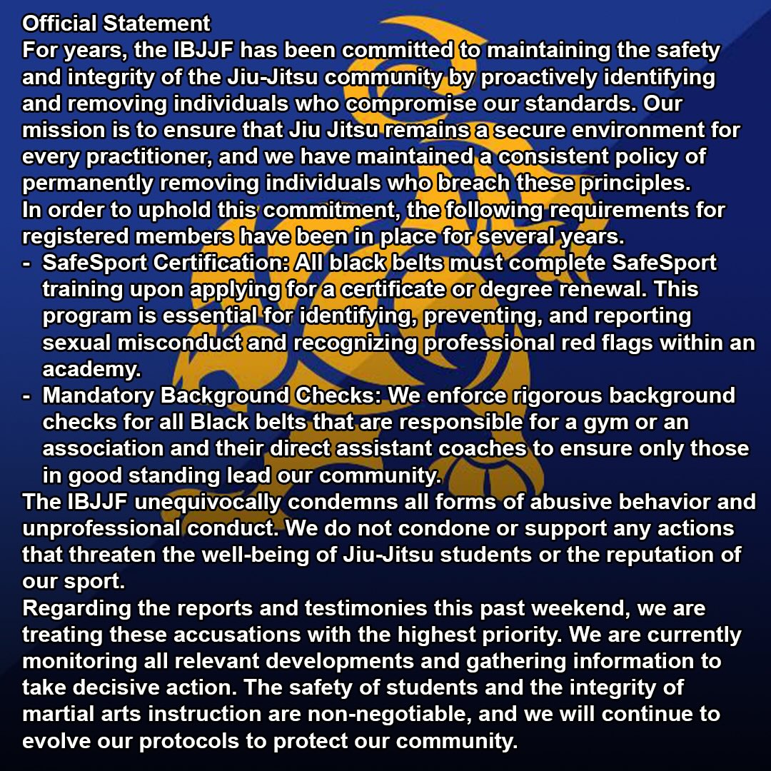 “The IBJJF unequivocally condemns all forms of abusive behavior and unprofessional conduct. We do not condone or support any actions that threaten the well-being of Jiu-Jitsu students or the reputation of our sport.”
