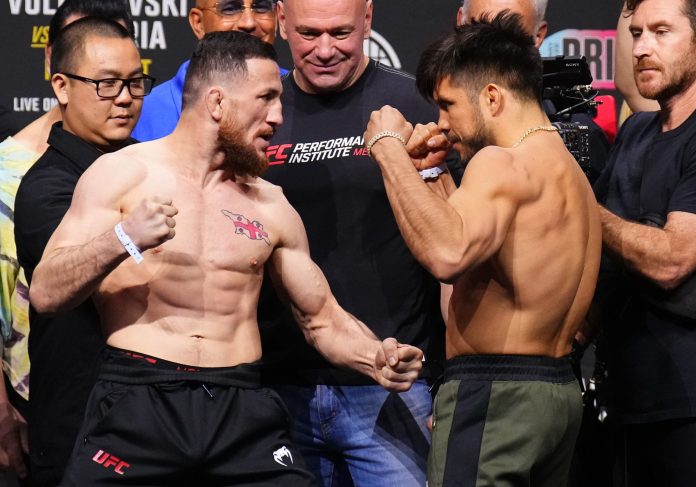 ANAHEIM, CALIFORNIA – FEBRUARY 16: (L-R) Opponents Merab Dvalishvili of Georgia and Henry Cejudo face off during the UFC 298 ceremonial weigh-in at Honda Center on February 16, 2024 in Anaheim, California. (Photo by Chris Unger/Zuffa LLC via Getty Images) | Zuffa LLC via Getty Images