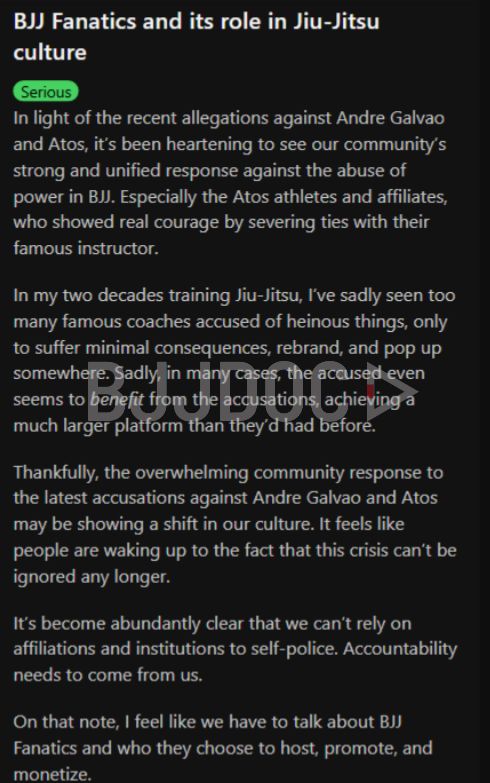 “Every business has a code of conduct and zero-tolerance policy, but too few actually enforce them unless customers speak up,” he wrote. “We don’t need to get carried away being the morality police, but some of the folks being hosted by BJJ Fanatics should be clear no-brainers for removal. Any quality gym in America would kick out a student facing these levels of misconduct allegations.”
