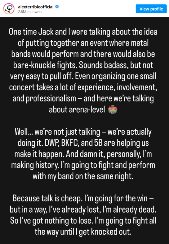 “Going to fight all the way until I get knocked out” – Deathcore musician Alex Terrible set to fight and perform at BKFC