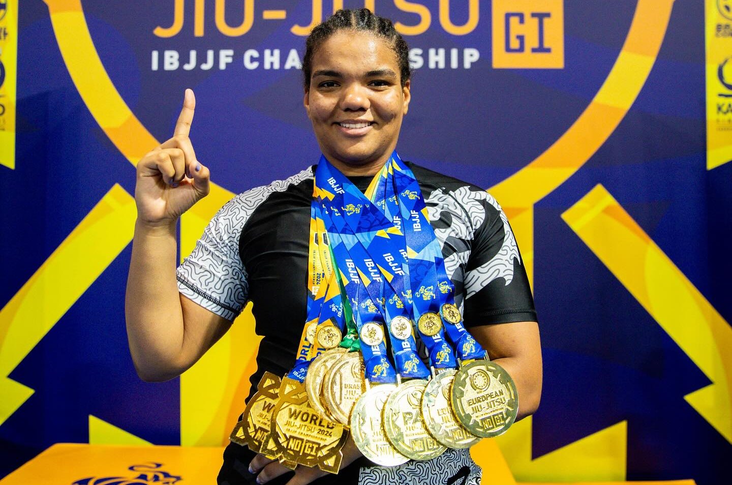 IBJJF credits her as the only grappler to win a no gi double grand slam, and she has now won every single IBJJF Crown title since it was created. Pessanha now has 10 world titles in the gi — double gold every year from 2021 to 2025 — and two world titles in no gi, which she only started in 2024.