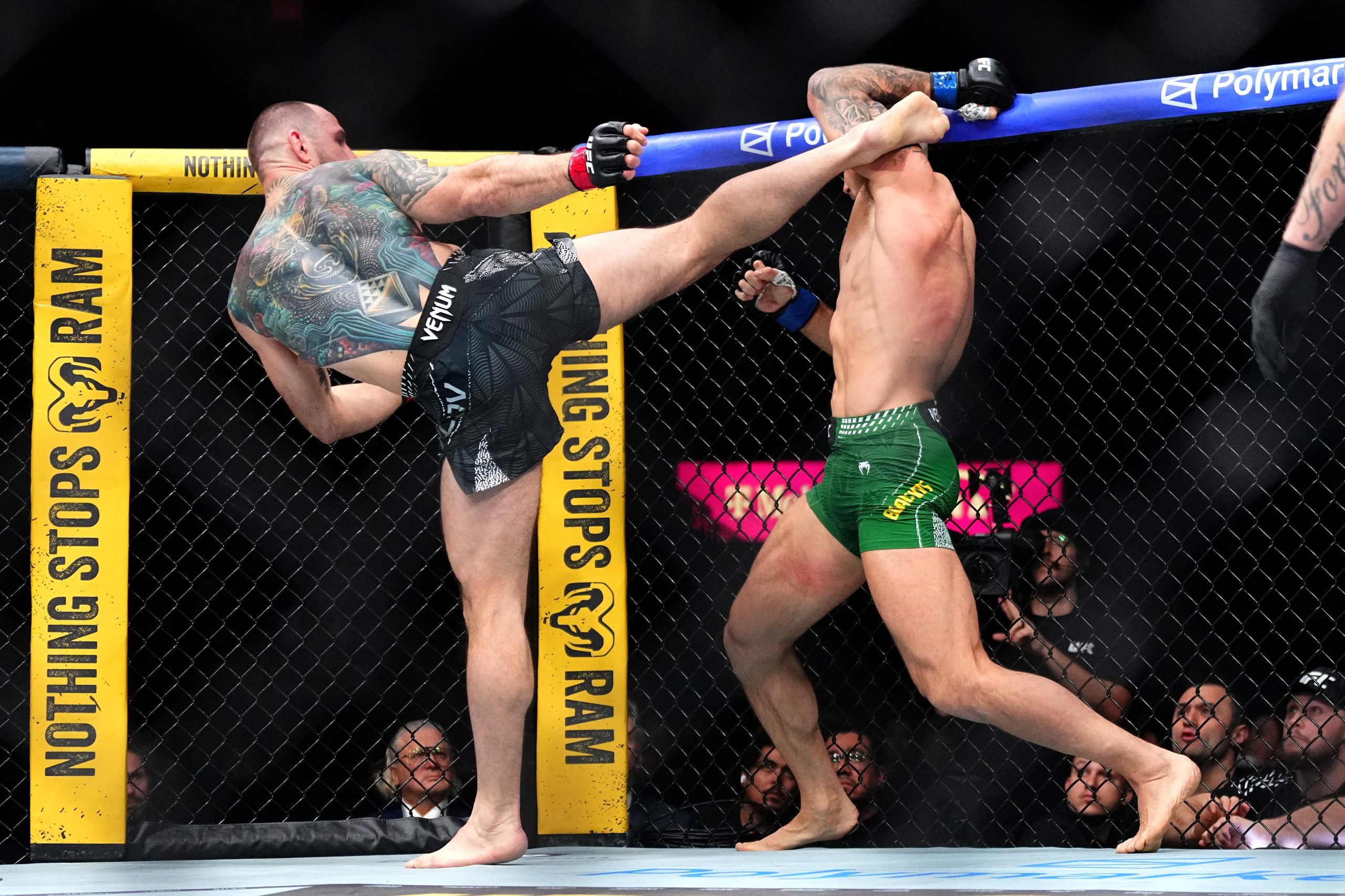 Scousers may not get knocked out, but they certainly get knocked down! I lost count of how many times an exchange put Pimblett on his butt via sheer impact or an off-balanced “Baddy.” To his credit, Pimblett hung tough through a lot of bad moments and won the third round definitively. He spent a lot of time trying to time Gaethje’s dip with knees and uppercuts, but his best lands were actually the rare straight punches and frequent chopping low kicks that definitely wore down the veteran.
