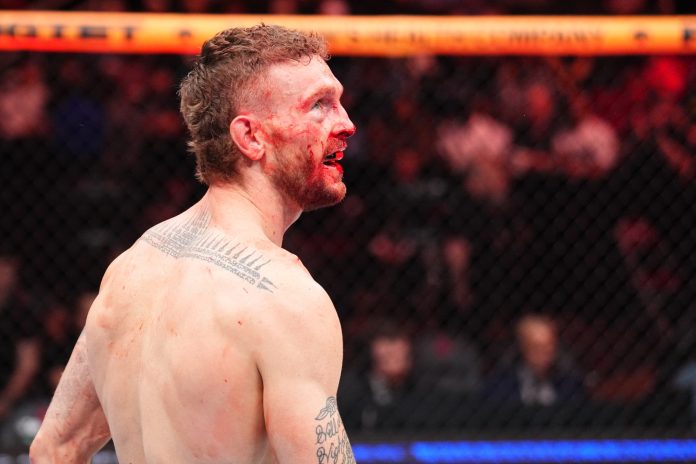 HOUSTON, TEXAS – FEBRUARY 21: Zach Reese reacts after round two against Michel Pereira of Brazil in a middleweight fight during the UFC Fight Night event at Toyota Center on February 21, 2026 in Houston, Texas. (Photo by Chris Unger/Zuffa LLC)