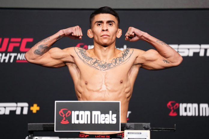 LAS VEGAS, NEVADA – JANUARY 12: Mario Bautista poses on the scale at UFC APEX on January 12, 2024 in Las Vegas, Nevada. (Photo by Chris Unger/Zuffa LLC via Getty Images) | Zuffa LLC via Getty Images