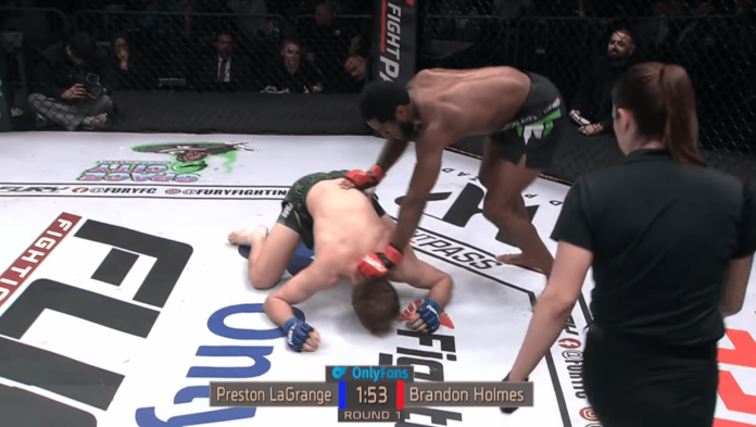 Contender Series Season 9 veteran Brandon Holmes returned to action following his failed bid for a UFC contract, taking on undefeated prospect Preston LaGrange. After roughly three minutes of grappling — with Holmes working inside LaGrange’s guard — LaGrange suddenly locked up a tight triangle choke.